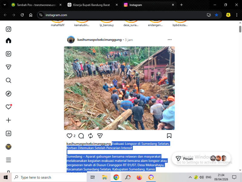 SUMEDANG,transtwonews.com – Aparat gabungan bersama relawan dan masyarakat melakukan evakuasi material longsor akibat pergeseran tanah di Dusun Ciranggon RT 01/07, Desa Mekarahayu, Kecamatan Sumedang Selatan, Kabupaten Sumedang, Kamis (09/04/2026).